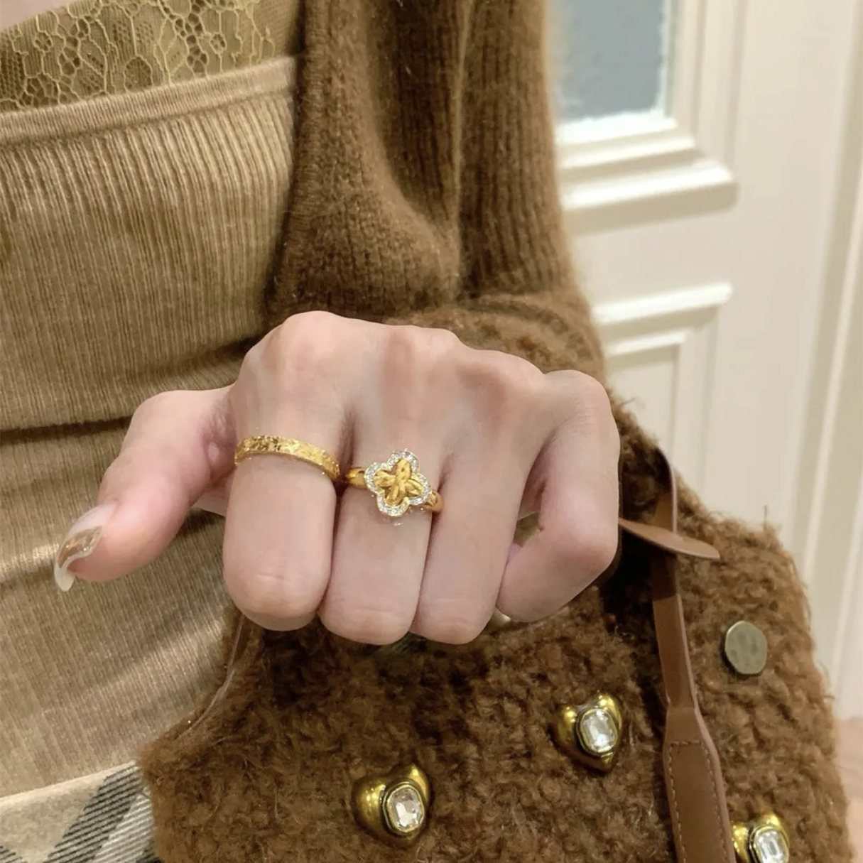 "Luck Goddess" Middle Ancient Golden Drawing Vine Four-leaf Clover Ring vintage Light Luxury Zircon Ring for Women