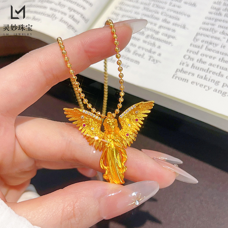 Gold Store Same Style Sand Gold Dot Diamond Guardian Angel Pendant Necklace Praying Goddess Statue Bead Chain Exquisite Gift for Girlfriend