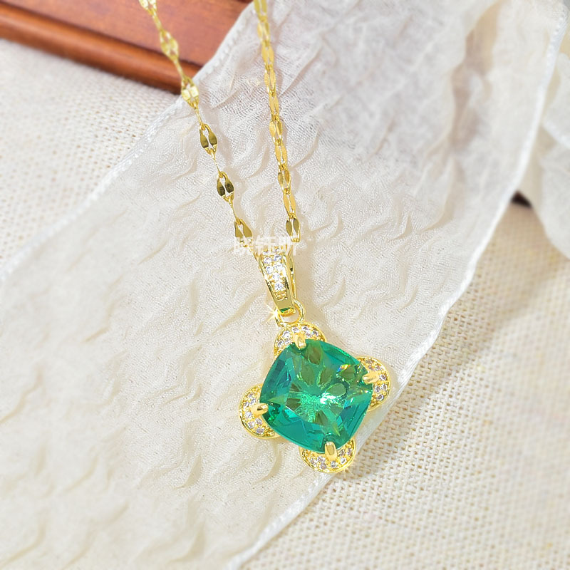 New Emerald Fatty Square Caibao Geometric Necklace Women's Summer Fresh Goddess Collarbone Necklace Emerald Pendant