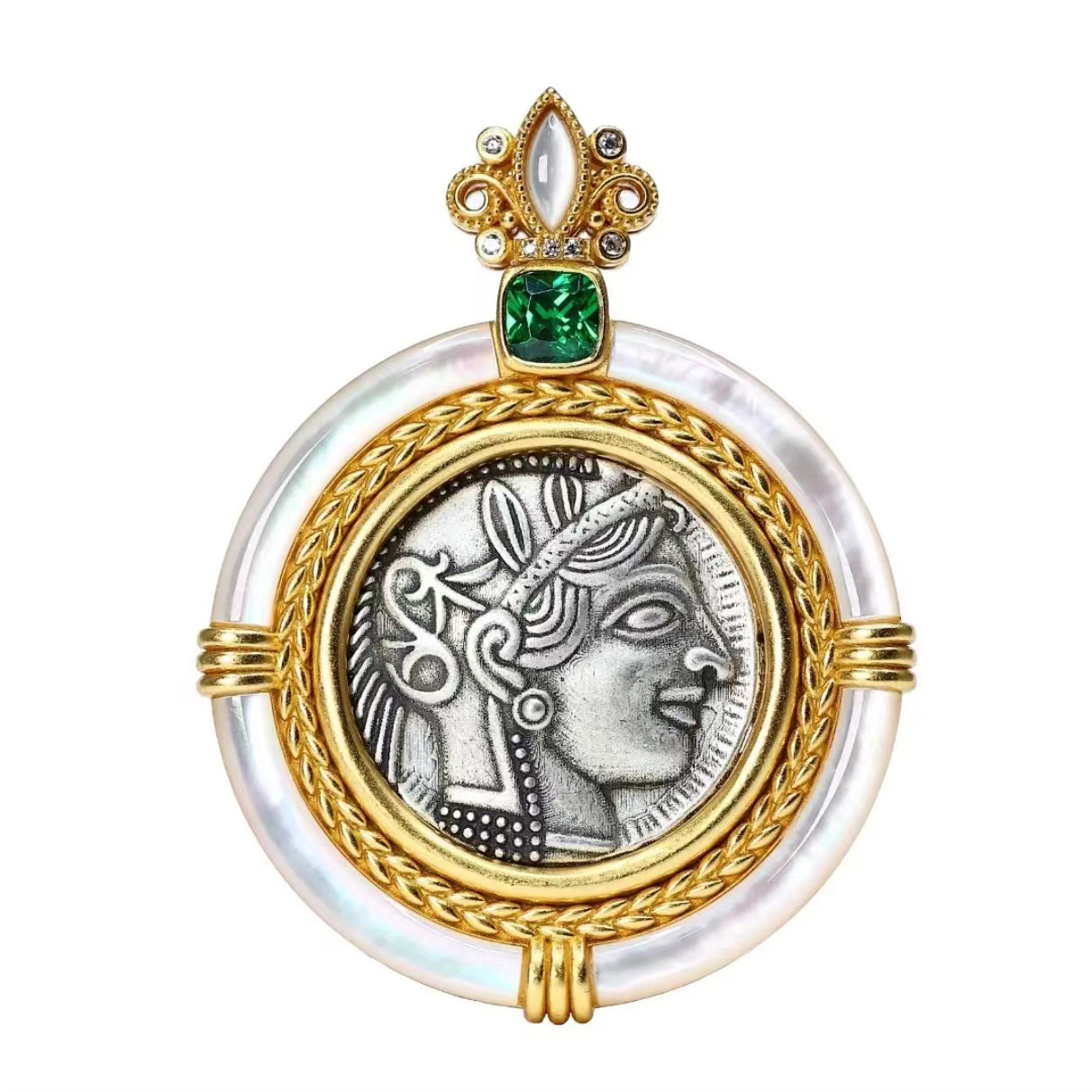French retro craft double-sided engraved goddess Athena owl ancient coin pendant natural fritillary green diamond necklace