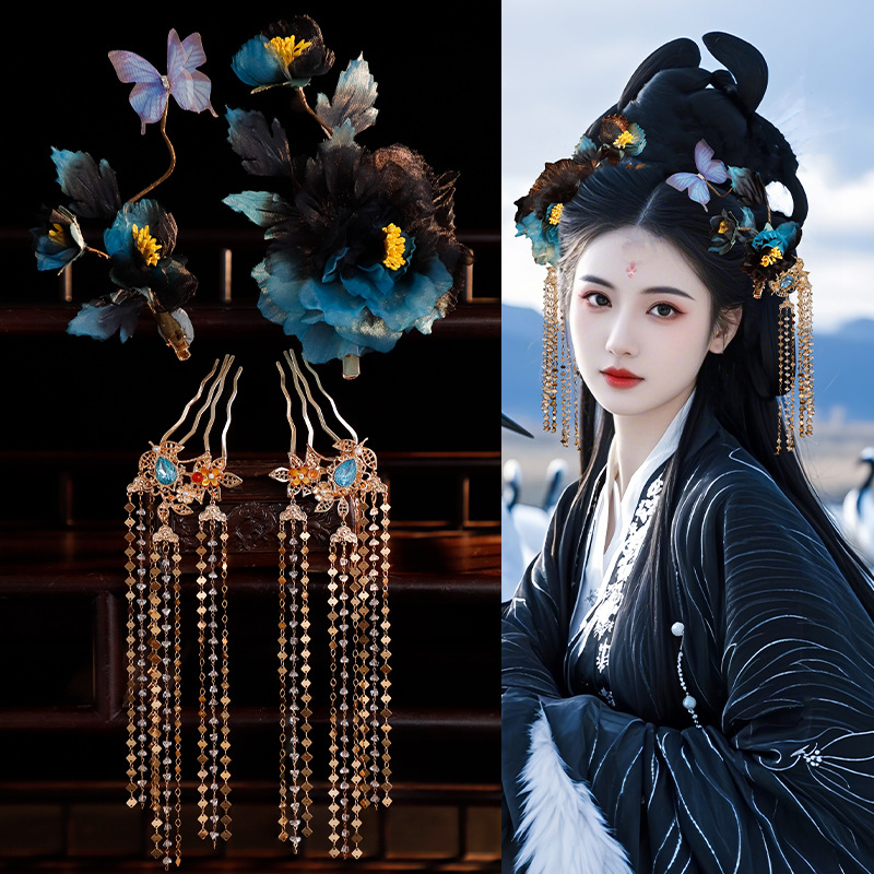 Antique Dark Goddess Hair Accessories Silk Yarn Hot Stamping Hairpin Tassel Hair Hairpin Step Covering Hinge Hair Accessories Combination Hanfu Headwear