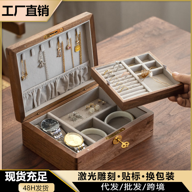 Black Walnut Solid Wood Jewelry Box with Interlayer Storage, Lockable Jewelry Box for Rings, Necklaces, Bracelets, Vintage Wooden Box
