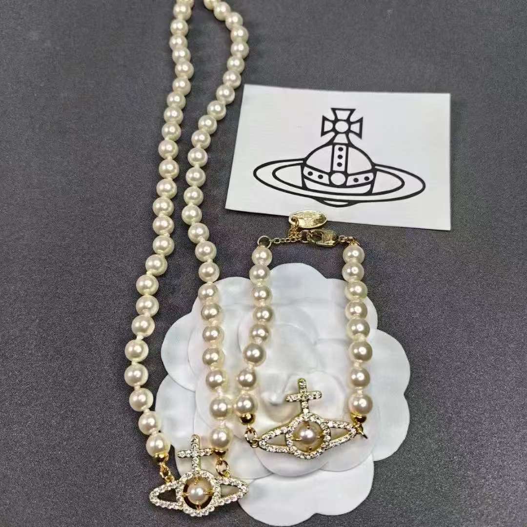 Empress High Version Pearl Cross Necklace Saturn Diamond Planet Light Luxury High-End Bead Bracelet Set