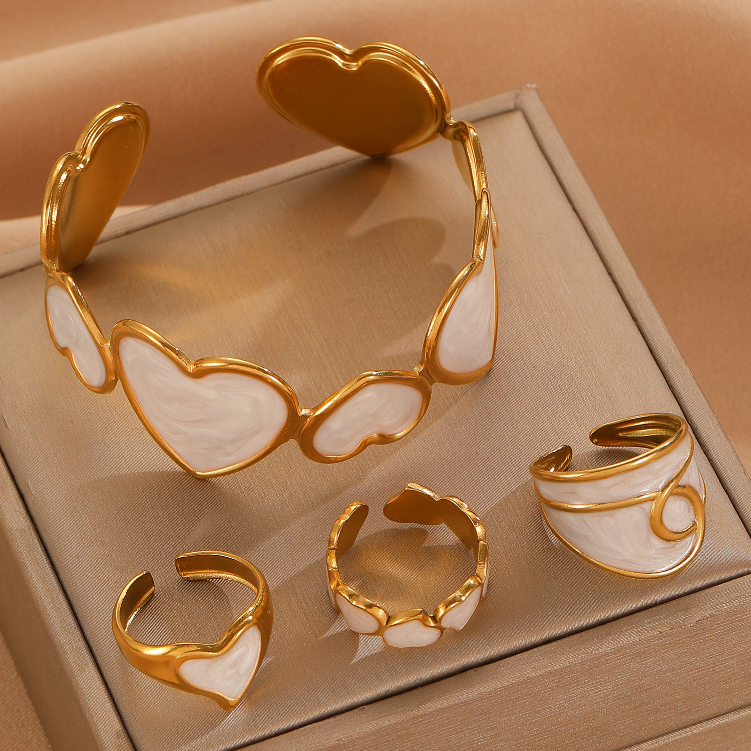 European and American Style 18K Real Gold Stainless Steel Heart Oil Drop Open Bracelet Ring Set Fashionable Versatile Jewelry for Women
