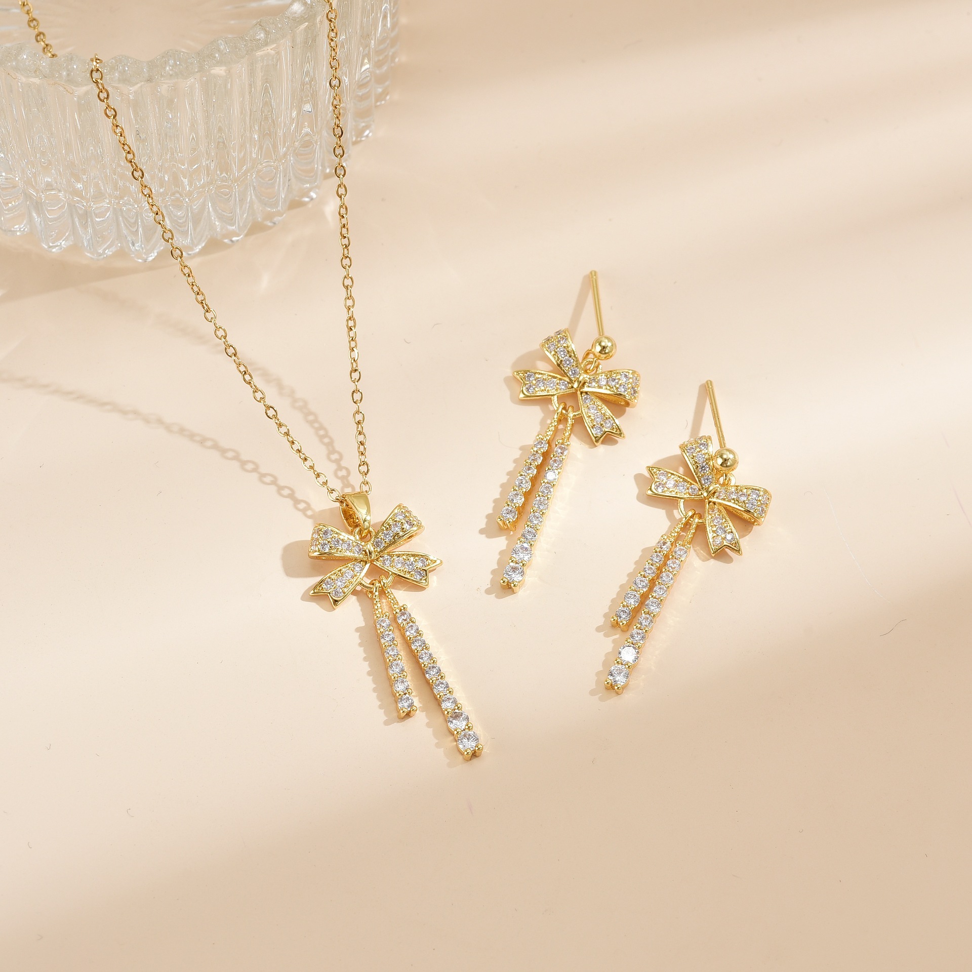 Cross-Border Export Copper-Plated Real Gold Micro-Paved Zircon Double Hanging Bow Tassel Necklace Women's Earrings Set Decoration Accessories