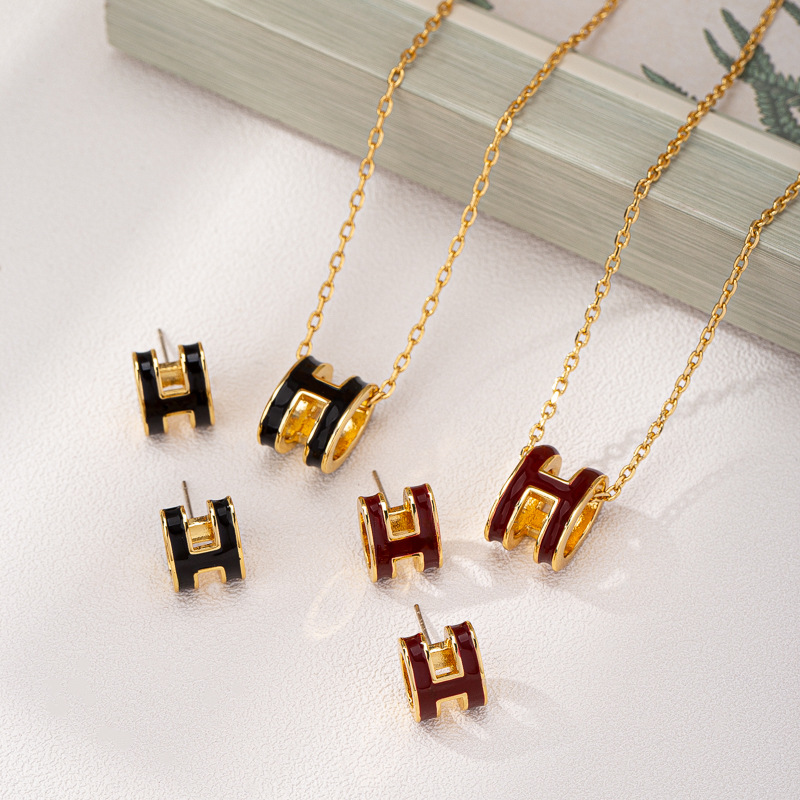 H Necklace High Version 18k Plated Gold Enamel Craft Clavicle Chain Simple High-end Ear Stud Versatile Jewelry suit