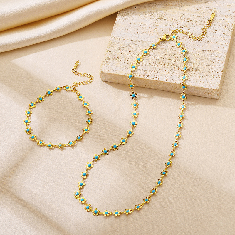 Ins European and American Personalized Gold Flower Blue Oil Dripping Necklace Titanium Steel Plated 18K Real Gold Bracelet Set Accessories Pendant