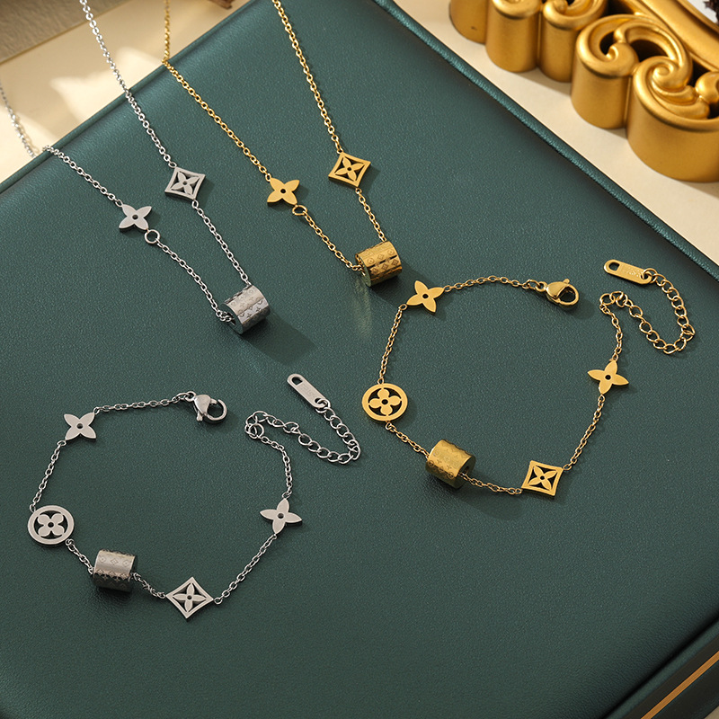 Korean Style Small Waist Presbyopic Four-Leaf Flower Necklace Bracelet Women's Niche Design Accessible Luxury High-End Set Jewelry Does Not Fade