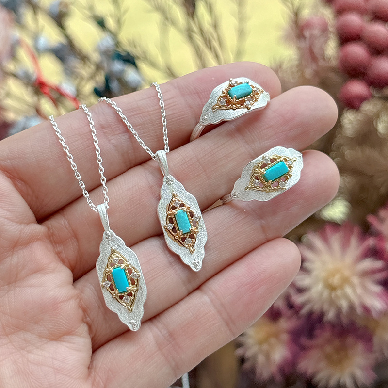 Japanese-Style Light Luxury 25-Year New Birthstone Natural Turquoise Lace Splicing Electroplated Necklace Silver Gold-Plated Set