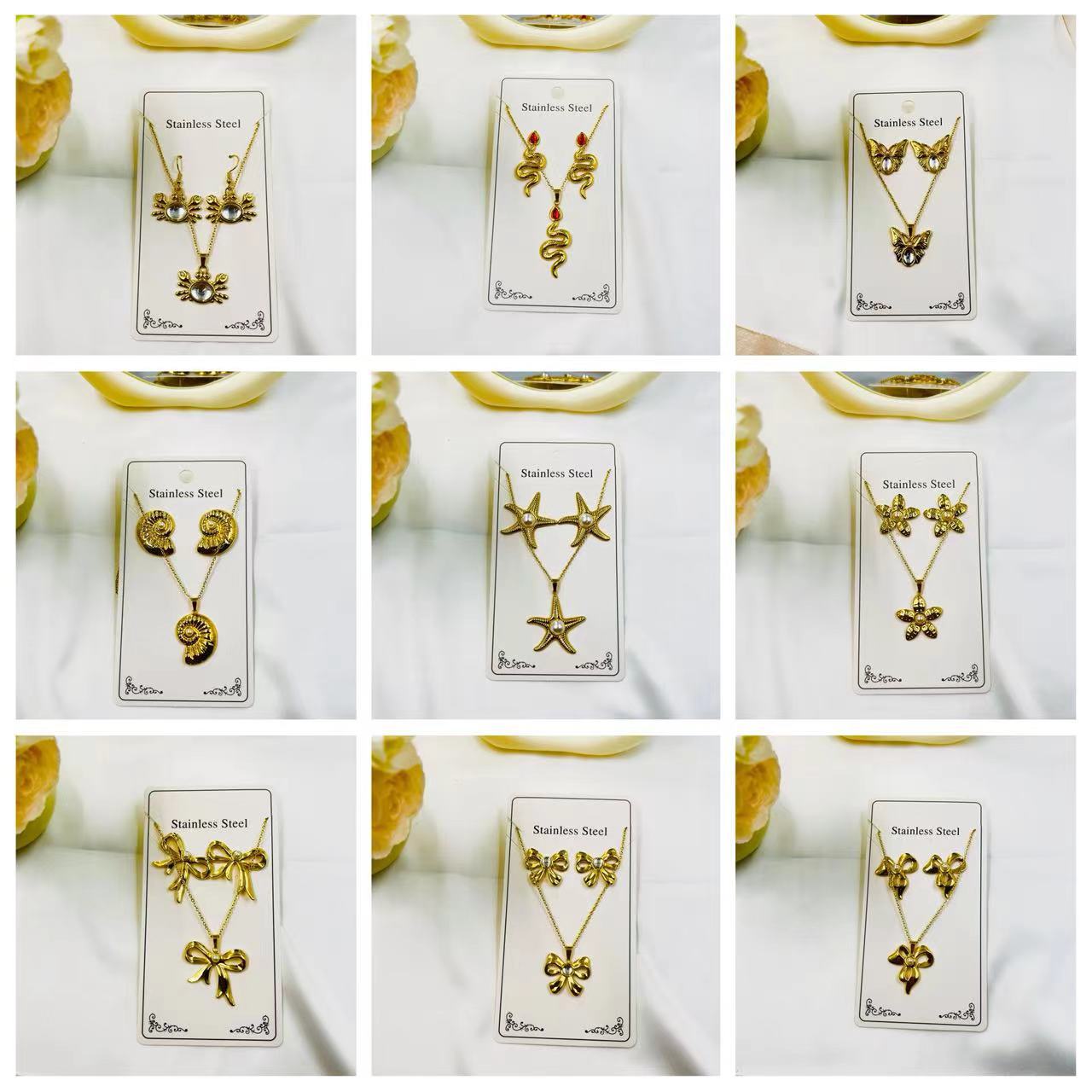 Factory Direct Sales Hydraulic Set Gongyan Insect Ocean Earrings Vintage Hollow Lantern Stainless Steel Gold-Plated Necklace