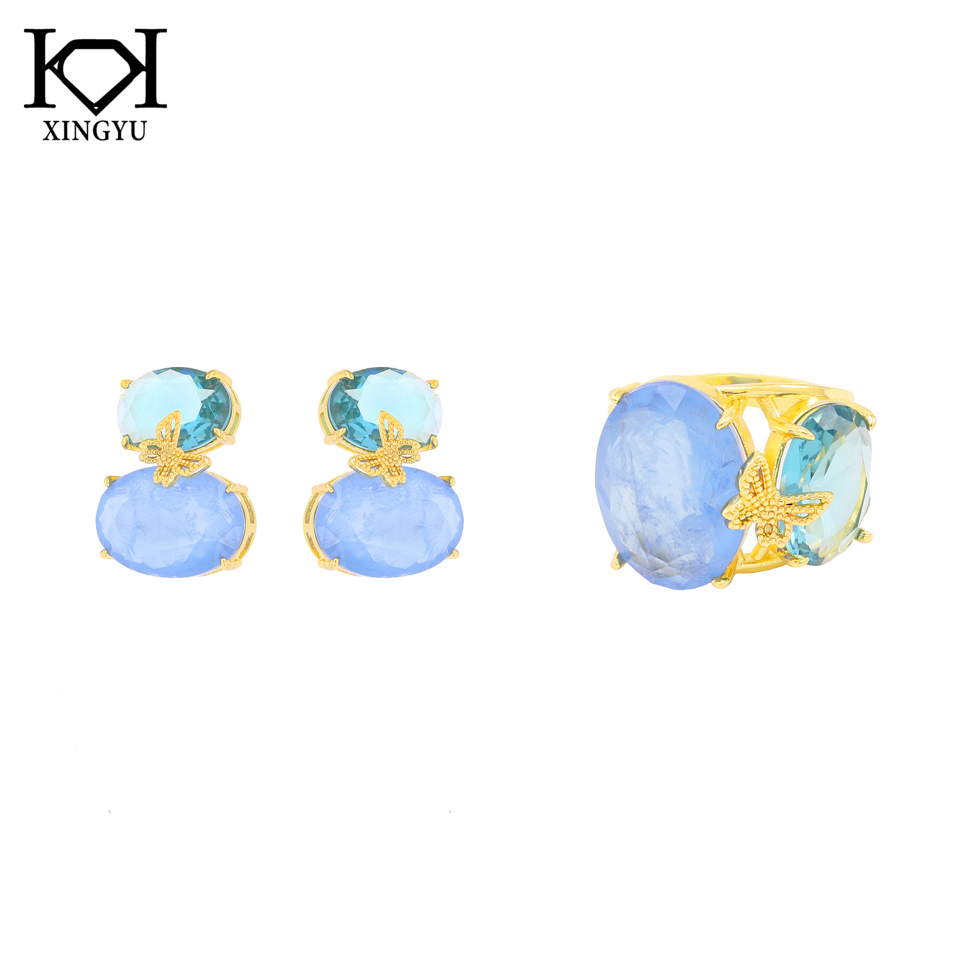 Butterfly Luxury Pink Diamond Color Treasure Oval Ring Earrings Aquamarine Color Treasure Copper Plated Gold Jewelry suit Women