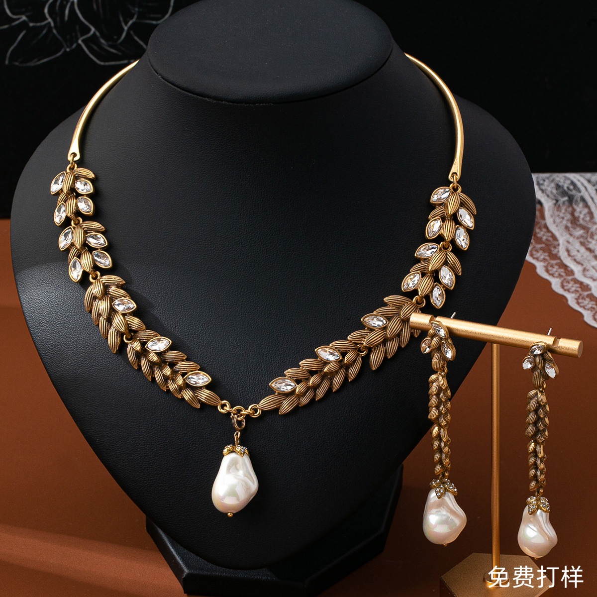 Retro Vintage Set of Decorations European and American Cross-Border Wheat Leaves High-End Earrings Baroque Necklace Tassels