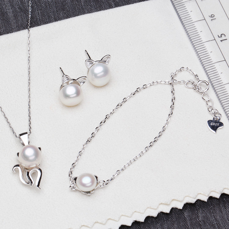 S925 silver DIY cute cat natural freshwater pearl pendant necklace accessories three piece jewelry wholesale
