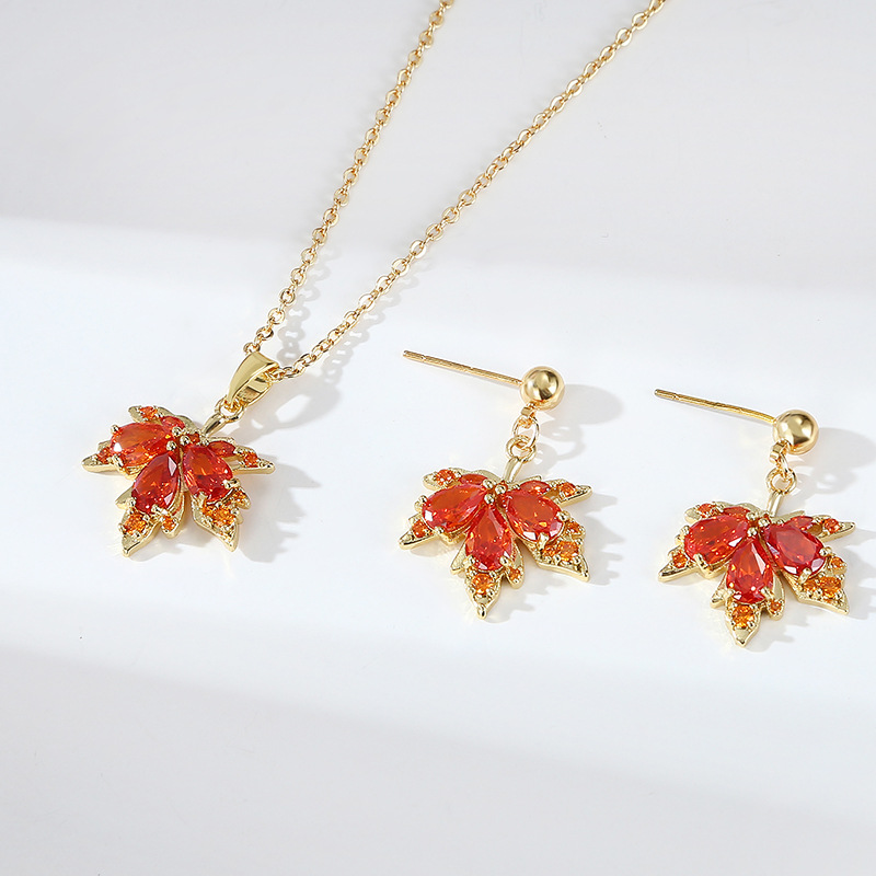 [Titanium Steel Chain] New Copper Zirconium Plated Real Gold Red Maple Leaf Pendant Necklace Clavicle Chain Leaf Earrings suit