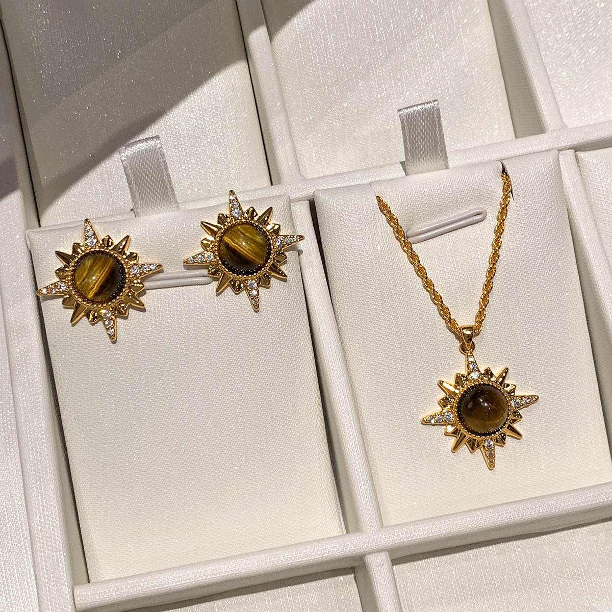 Tiger's Eye Stone Round Starburst Pendant Necklace Vintage Melard Collarbone Chain Fashion Simple Versatile Jewelry Set for Women