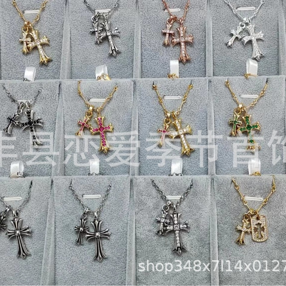 Croton Full Diamond Double Cross Necklace European and American Hip-Hop Trendy Retro Diamond-Encrusted Tiktok Jewelry Men's and Women's Clavicle Chain