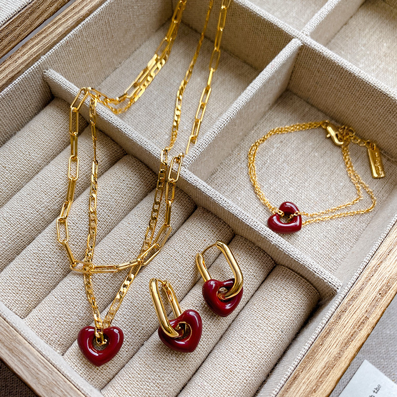 Ankora Red Vintage Enamel Love Heart Necklace Women's Light Luxury High-end Earrings Copper Plated Gold suit Accessories