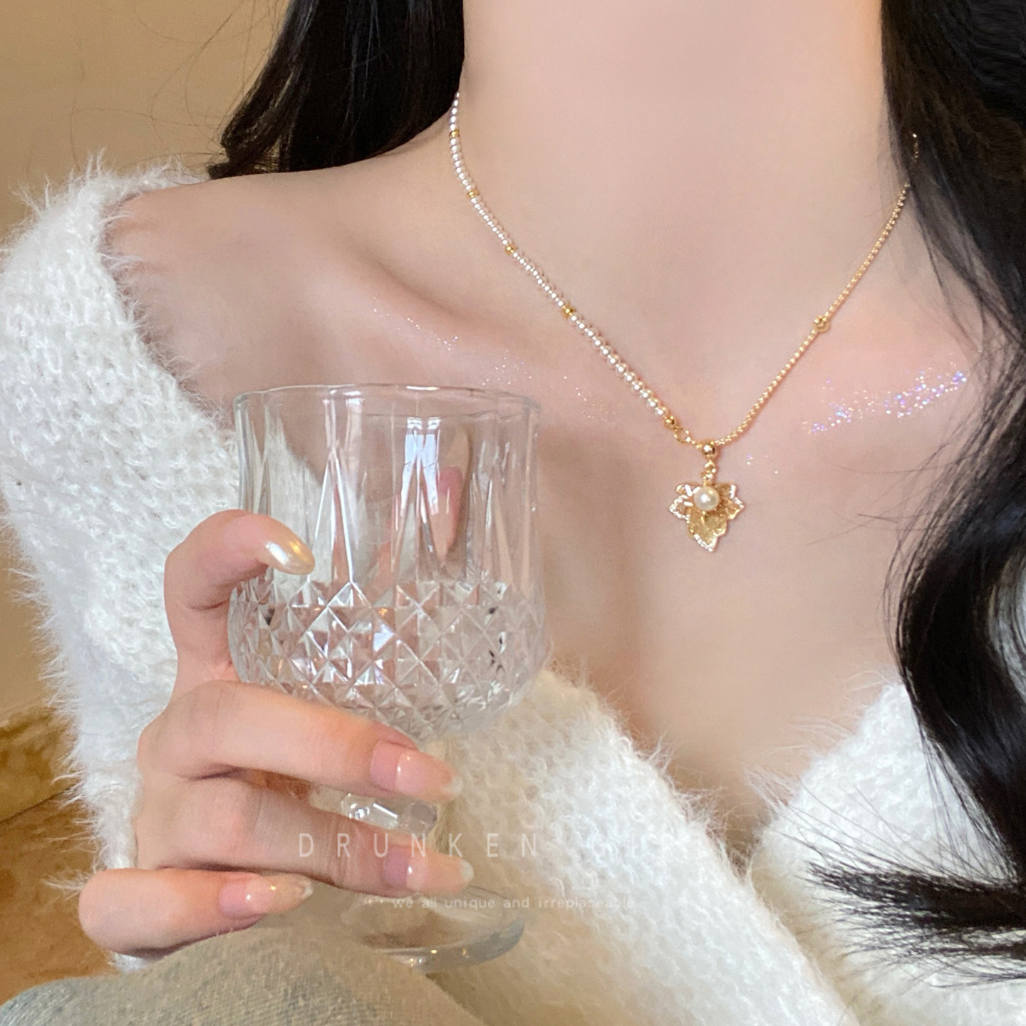 Real Gold Electroplated Zircon Pearl Beaded Maple Leaf Earrings Necklace Accessible Luxury Niche Clavicle Chain Elegant Jewelry Set for Women