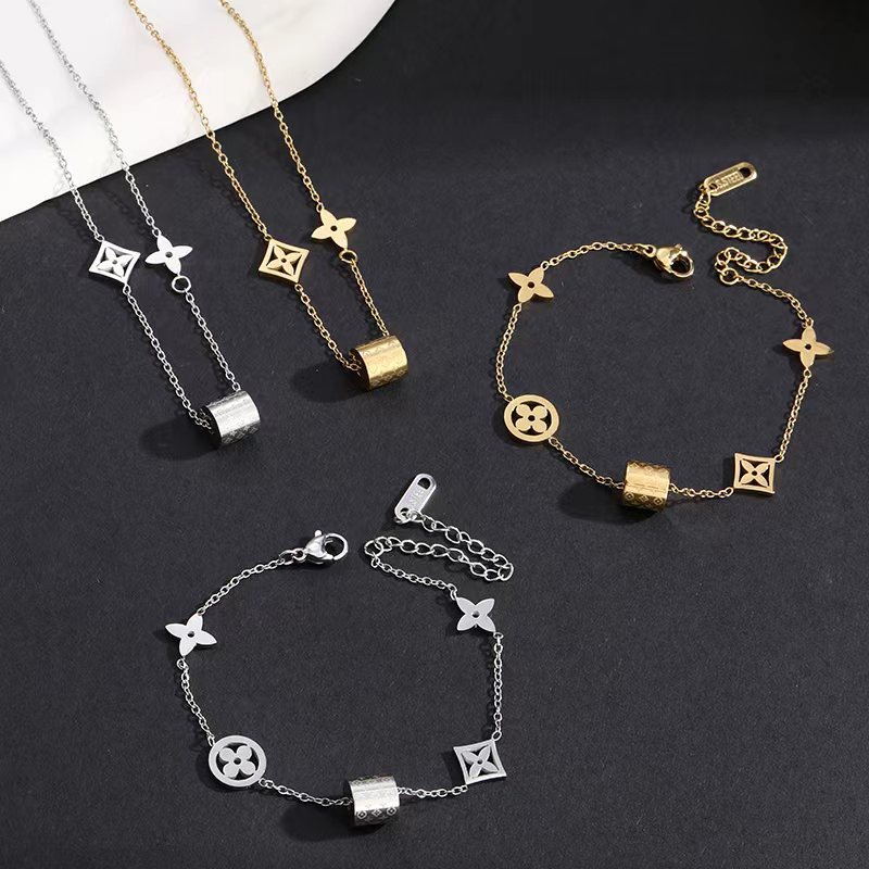 Versatile Hollow Lucky Flower Bracelet, Light Luxury Niche Design, Non-Fading Titanium Steel Set, Women's Necklace