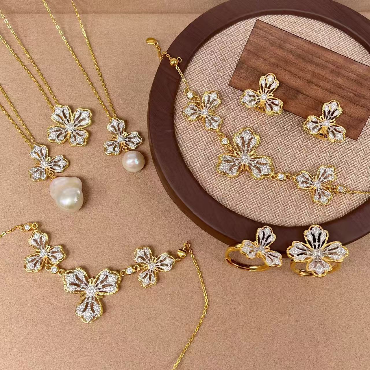 Cross-Border Hot-Selling Handmade Batch Flower 18K Furnace Real Gold Clover Earrings Necklace Bracelet Stainless Steel Set