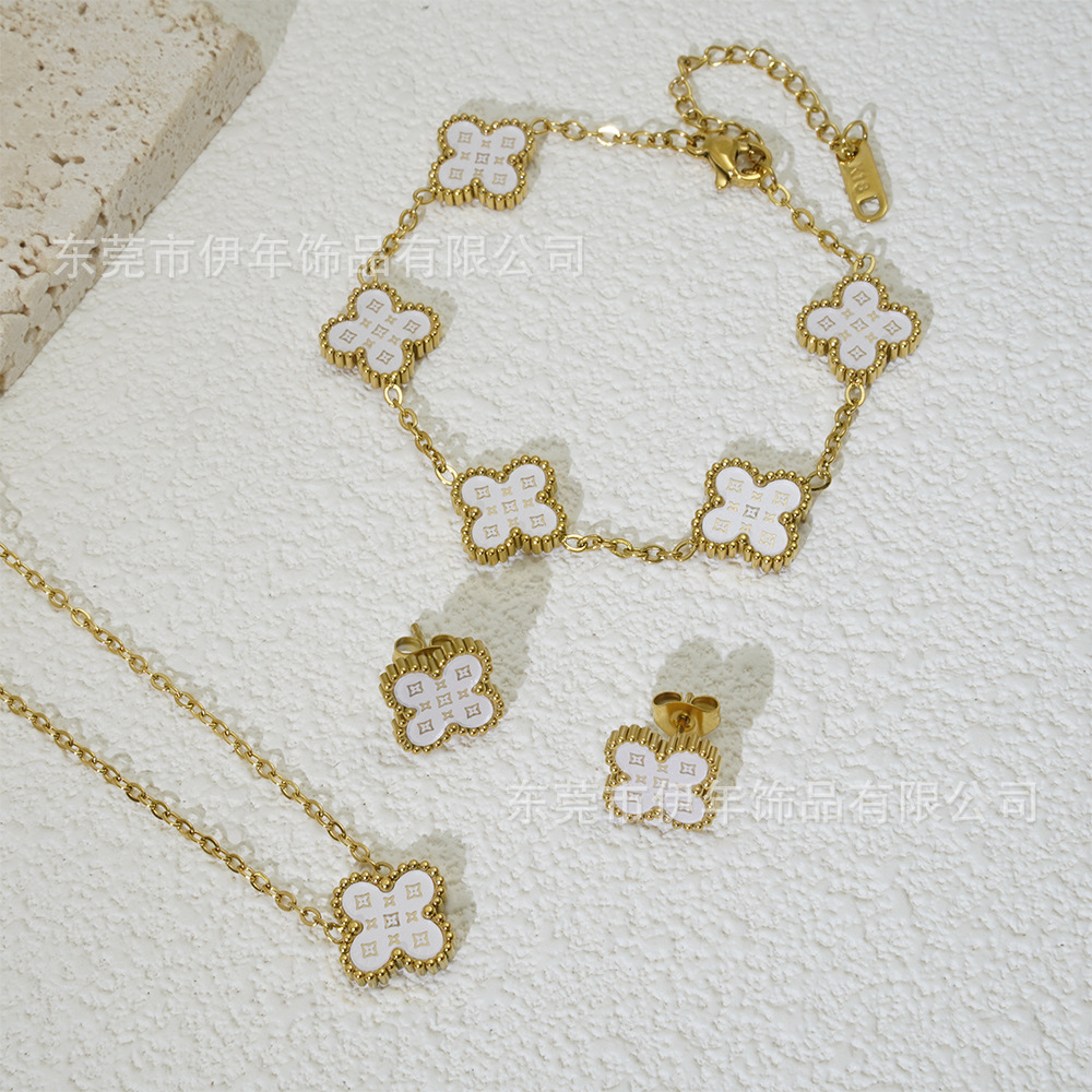 Versatile Clover Zircon Super Shiny Necklace Women's Bracelet Beautiful Set Stainless Steel Gold Plated Color Retention