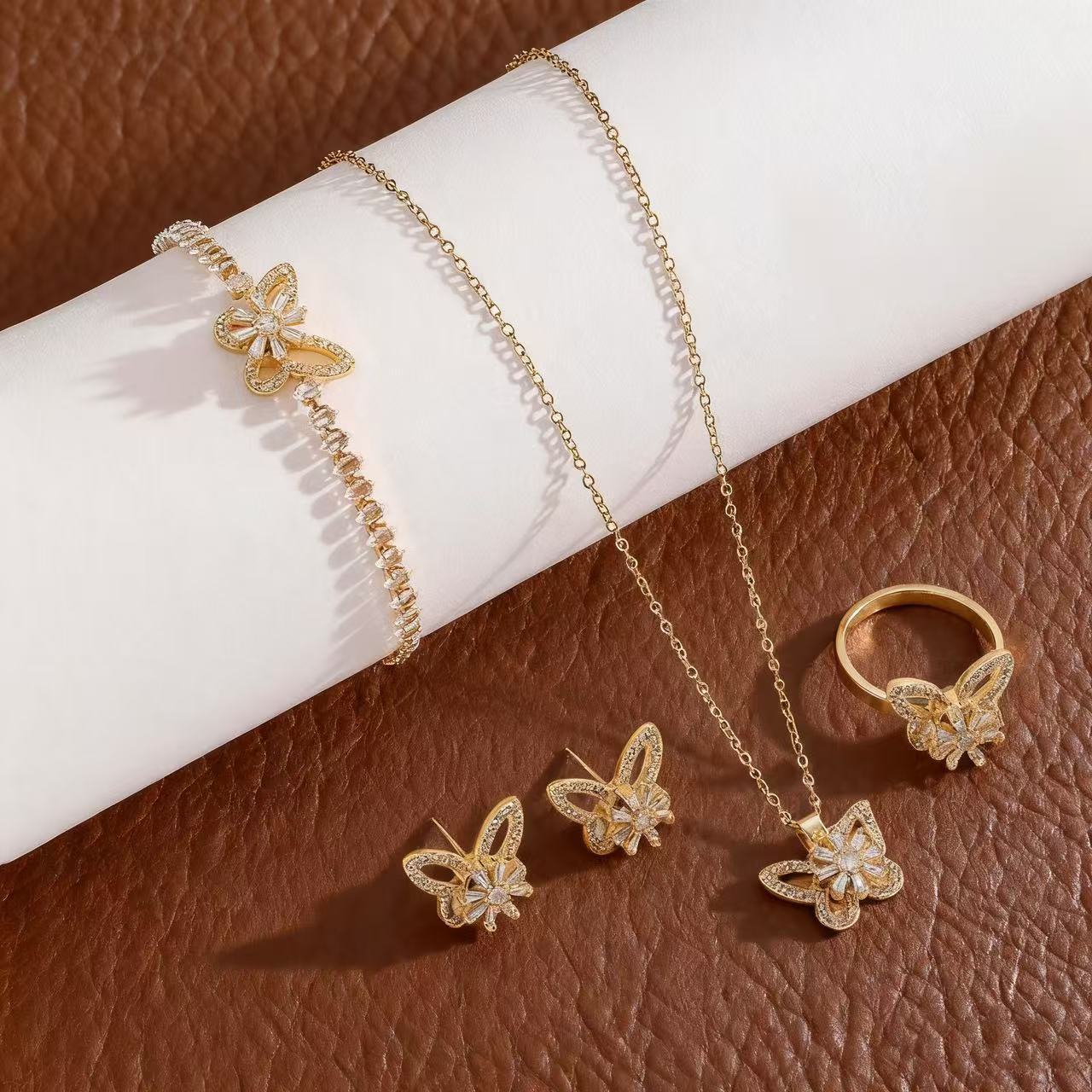 Cross-Border Butterfly Rotating Titanium Steel Necklace Women's Earrings Ring Bracelet Micro-Paved Zircon Set Fashionable Versatile Clavicle Chain