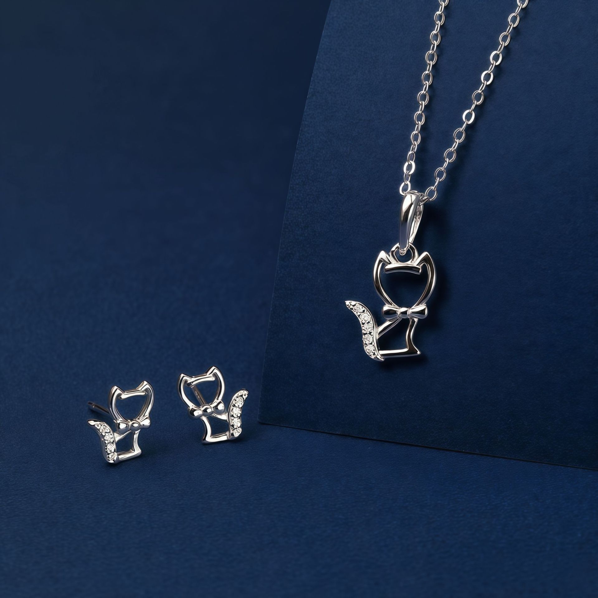 S925 Sterling Silver Zircon Cut Out Kitten Earrings for Women Simple Style Cute Clavicle Chain Sterling Silver Jewelry Set Wholesale