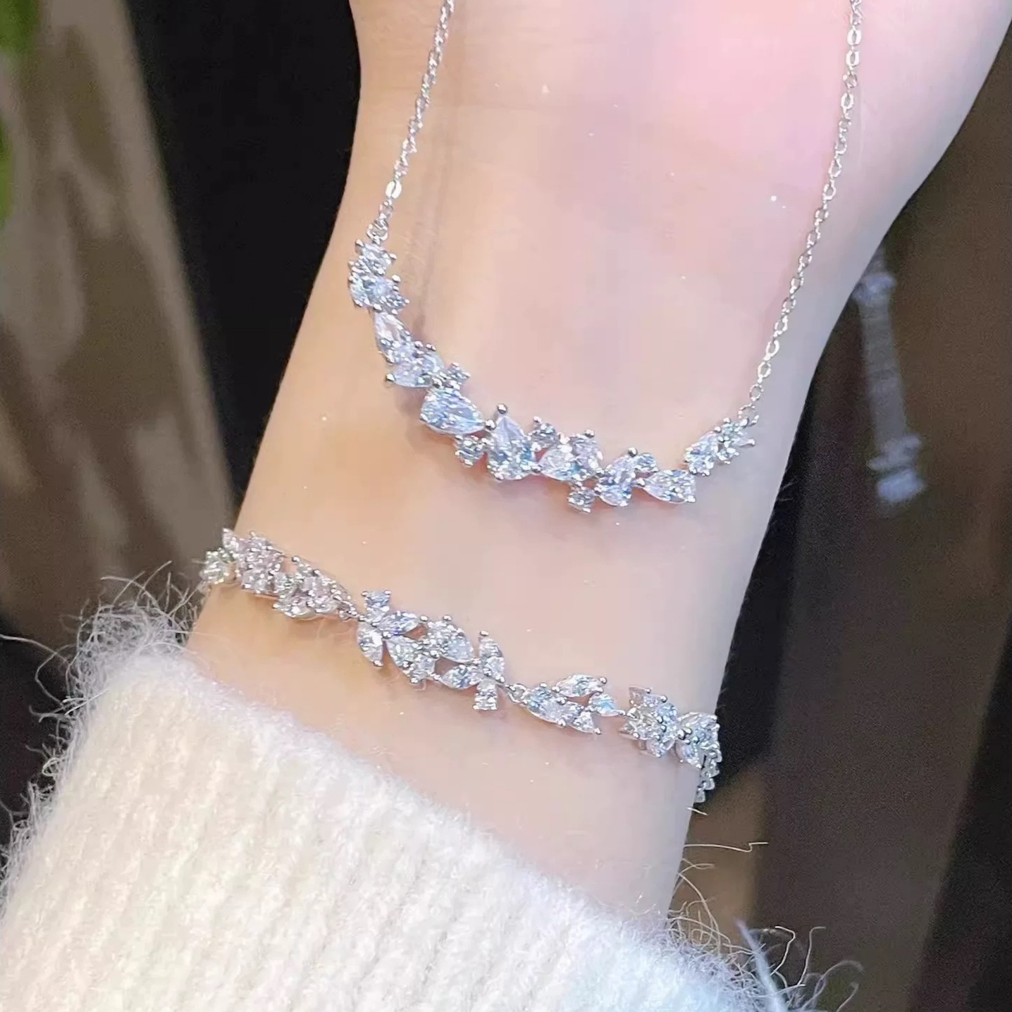 S999 Sterling Silver Jewelry Set for Women, Light Luxury Niche Design Clavicle Chain, Ultra-Shiny Wisteria Flower, Elegant and High-End Bracelet