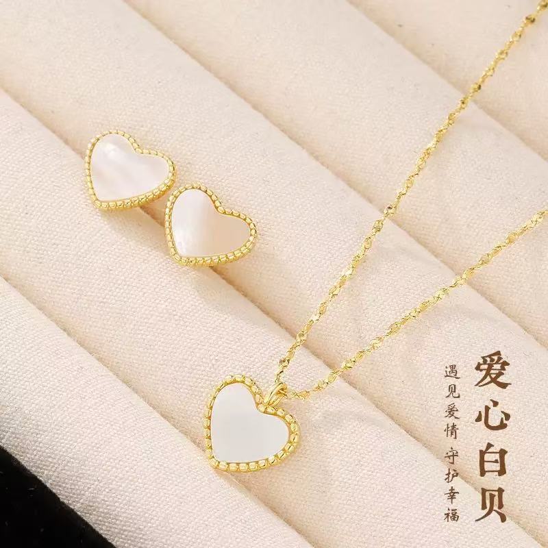 2024 New Popular Heart-Shaped White Mother-Of-Pearl Necklace and Earrings Set for Women, Light Luxury Niche Retro High-End Feel