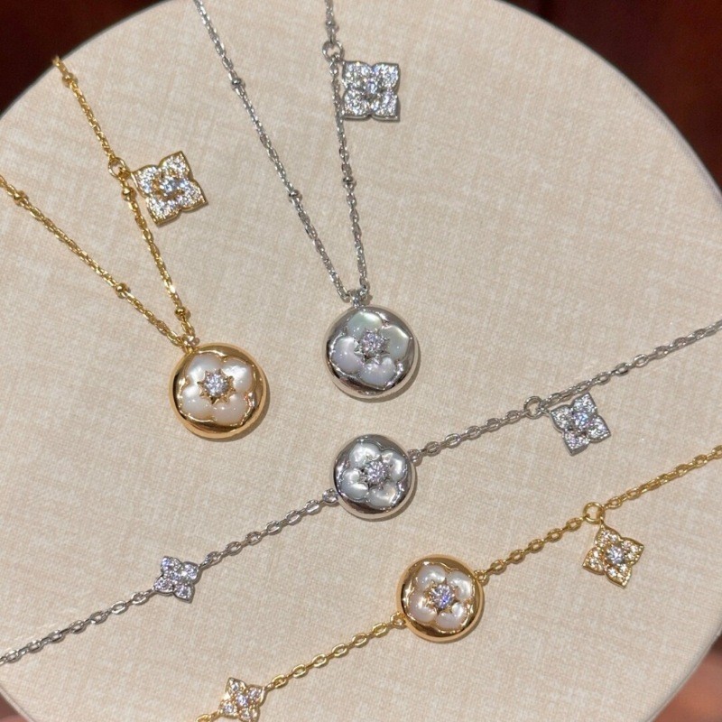 V Gold Plated Mi Gold Clover Flower Necklace CNC High Edition Full Diamond Bracelet suit High-end Elegant Factory Outlet