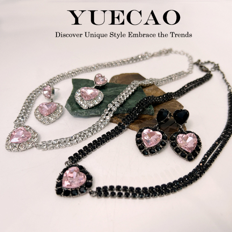 Sweet Cool Style Love Jewelry suit Pink Diamond Sexy Spice Girl Clavicle Chain Double-layer Dark Style Real Gold Plated High-grade Earrings