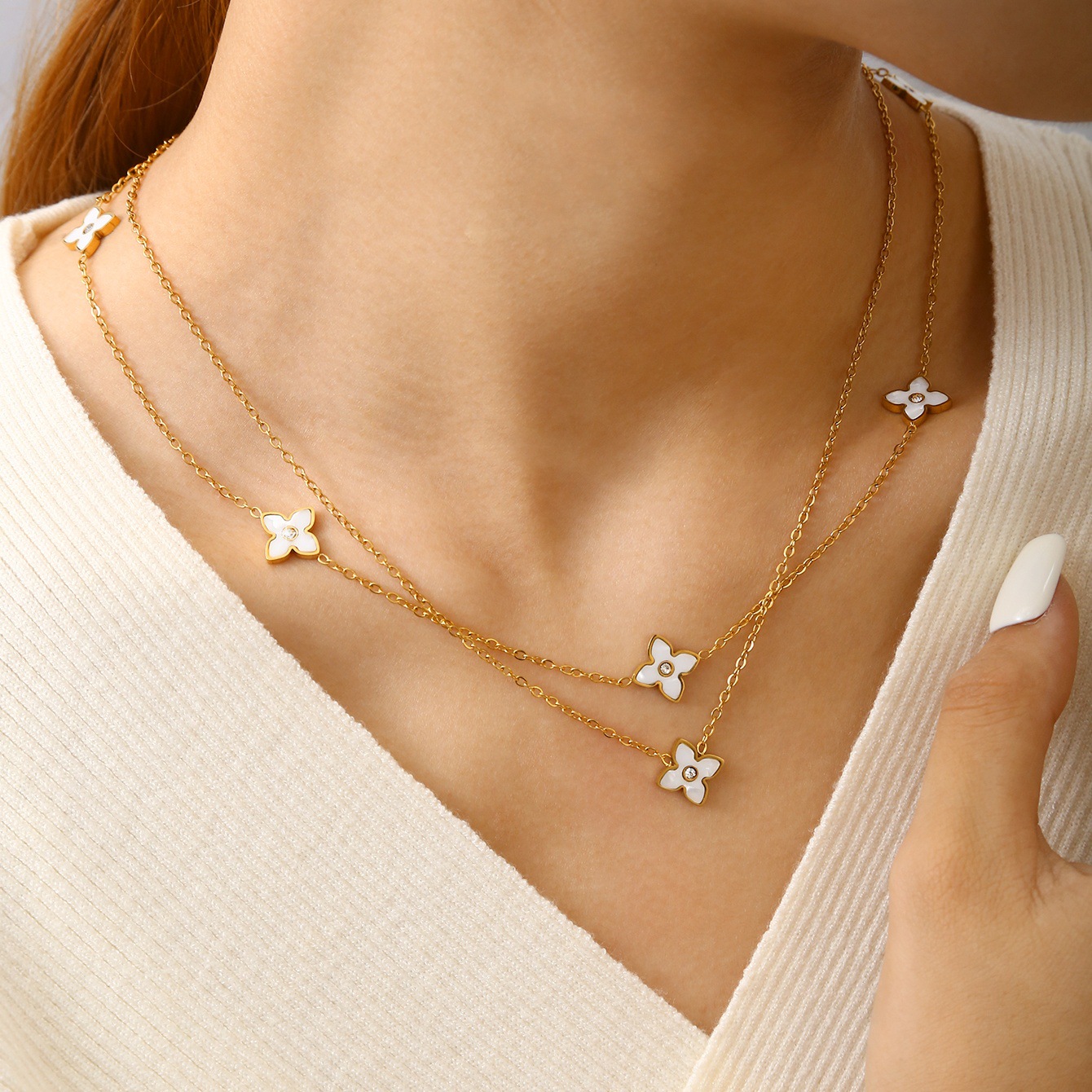 Korean Style Fashionable Simple Four-Leaf Clover Diamond Jewelry Set for Women Elegant Stainless Steel 18K Gold-Plated Necklace High-End
