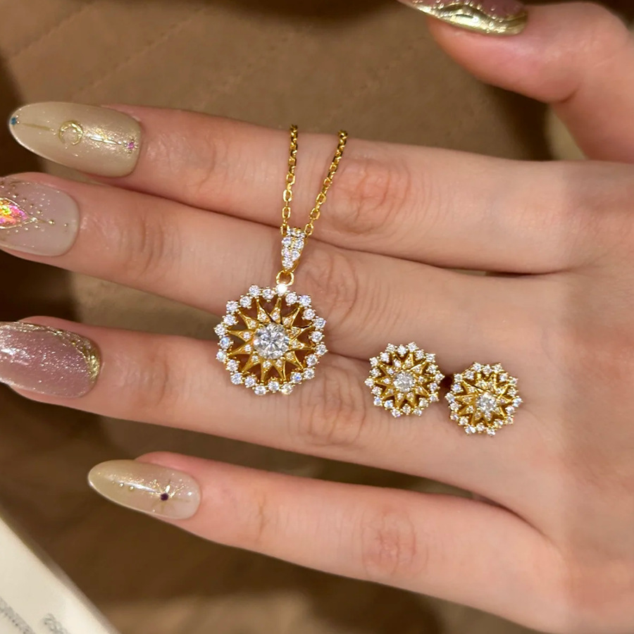 Imitation Moissanite Light Luxury Full Diamond Super Flash Snowflake Astrolabe Necklace Women's Pendant Sunflower Niche Design Earrings suit