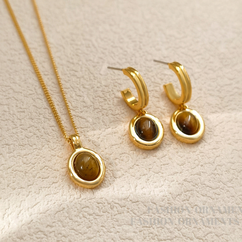 Copper Gold-Plated Retro niche Tiger Eye stone earrings necklace simple high-grade earrings female trendy clavicle chain 2379