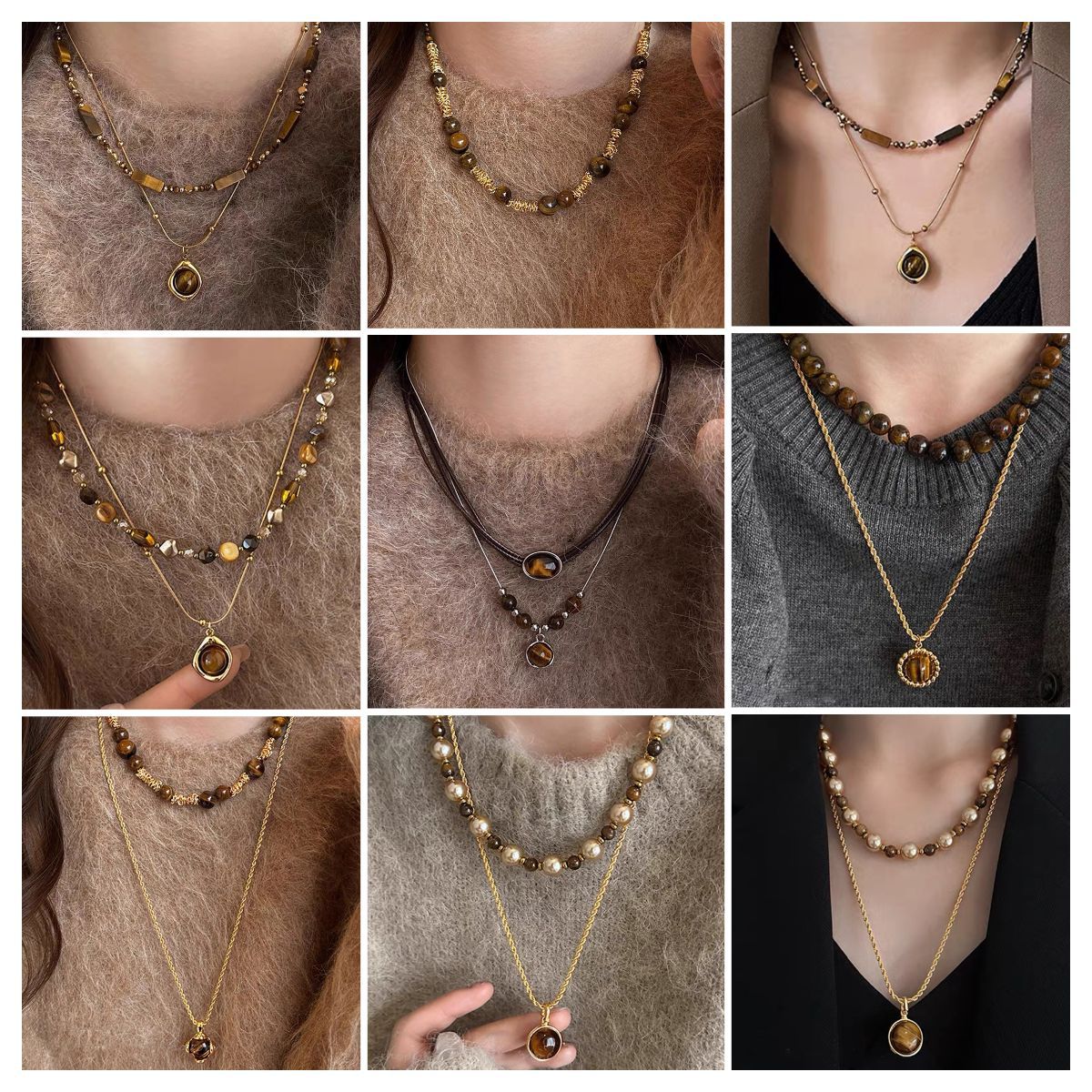 European and American Retro Coffee-Colored Tiger Eye Stone Beaded Pearl Necklace, Light Luxury Niche Clavicle Chain, Elegant and High-End Jewelry for Women