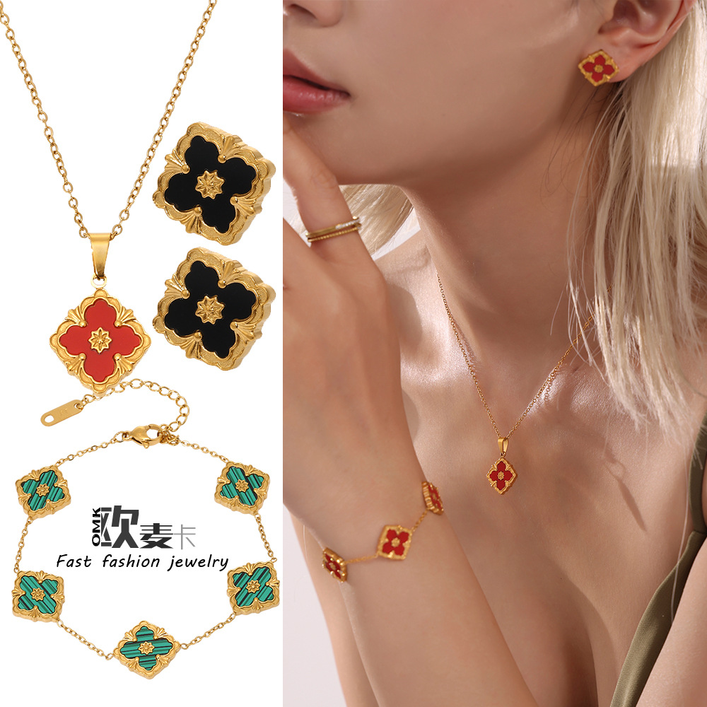 Diamond Court Style Four-leaf Flower Bracelet Necklace Earrings suit CNC High Version Quality Plating 18k Real Gold Craft