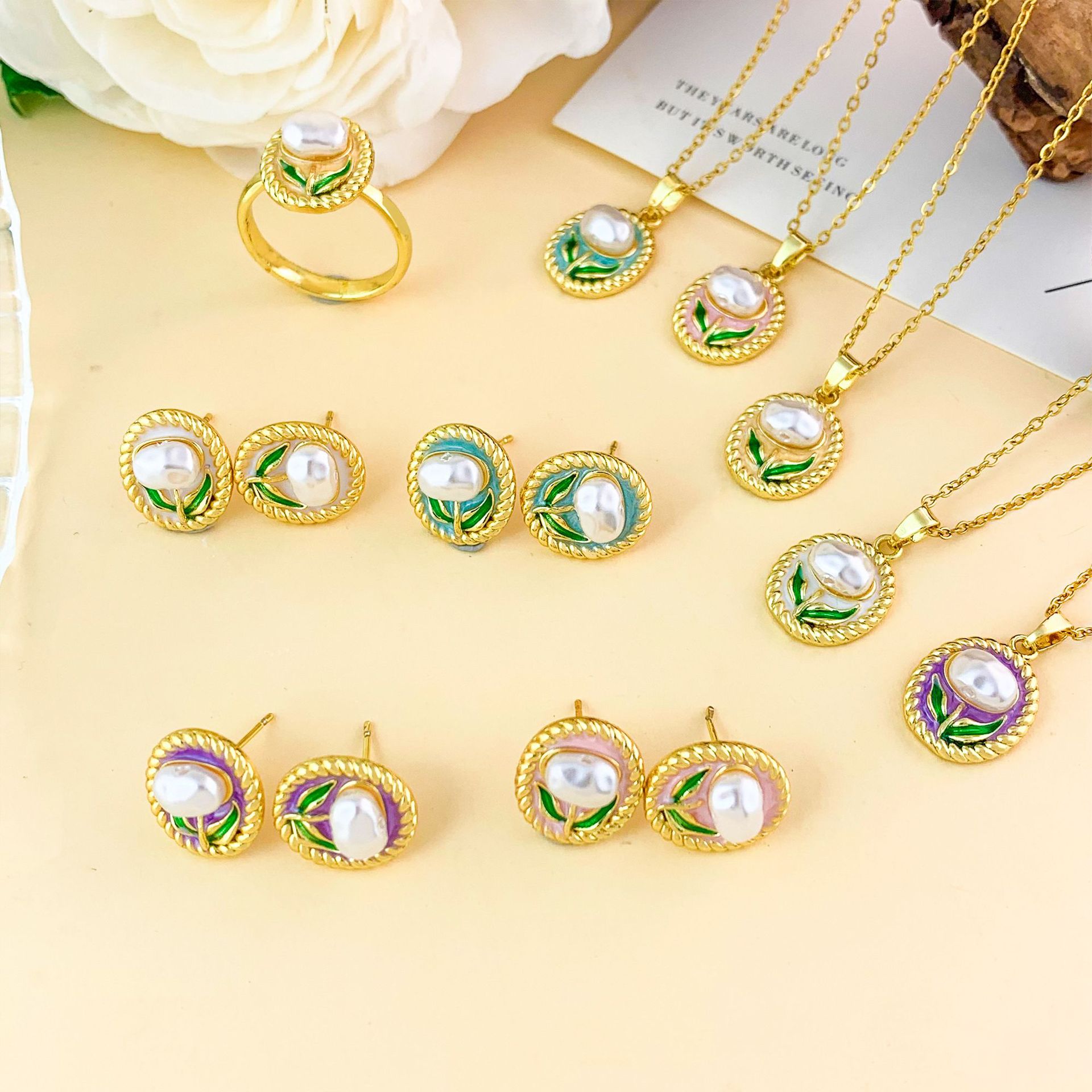 Necklace New Chinese Style Pearl Tulip Oil Painting Necklace Fashion Pearl Series National Style Metal Flower Jewelry Set
