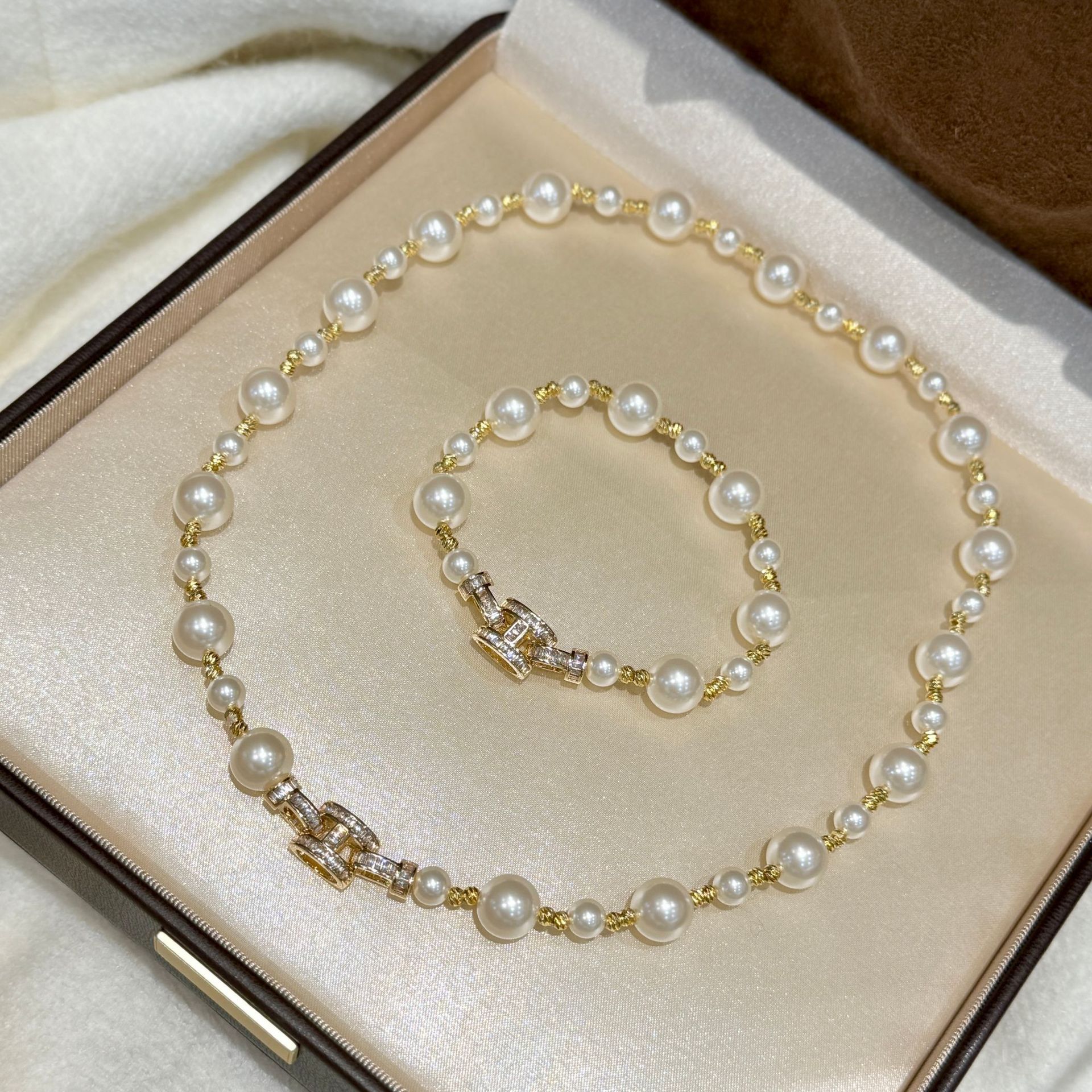 Shijia Pearl Bead String Ins Style Gold Carved Full Diamond Letter H Necklace Women's Light Luxury High-End Bracelet Set
