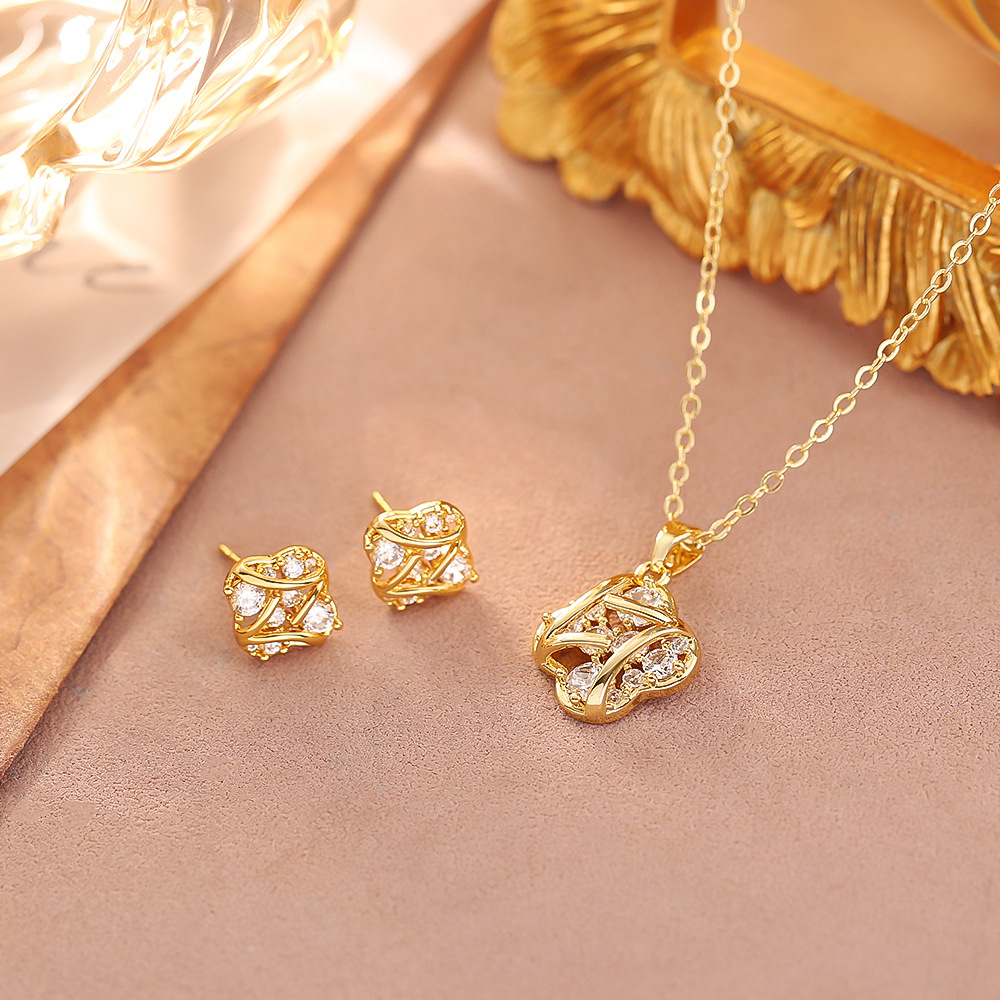 Cross-border new online celebrity style copper gold-plated triangle bow micro inlaid zircon light luxury earrings necklace two-piece suit