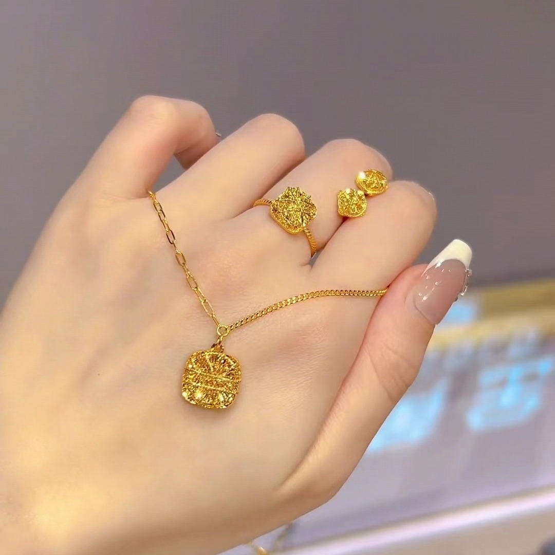 Little Red Book's Same Style Imitation Gold Color Sparkling Sugar Cube Earrings Necklace Set Brushed Small Square Ring Pendant Set