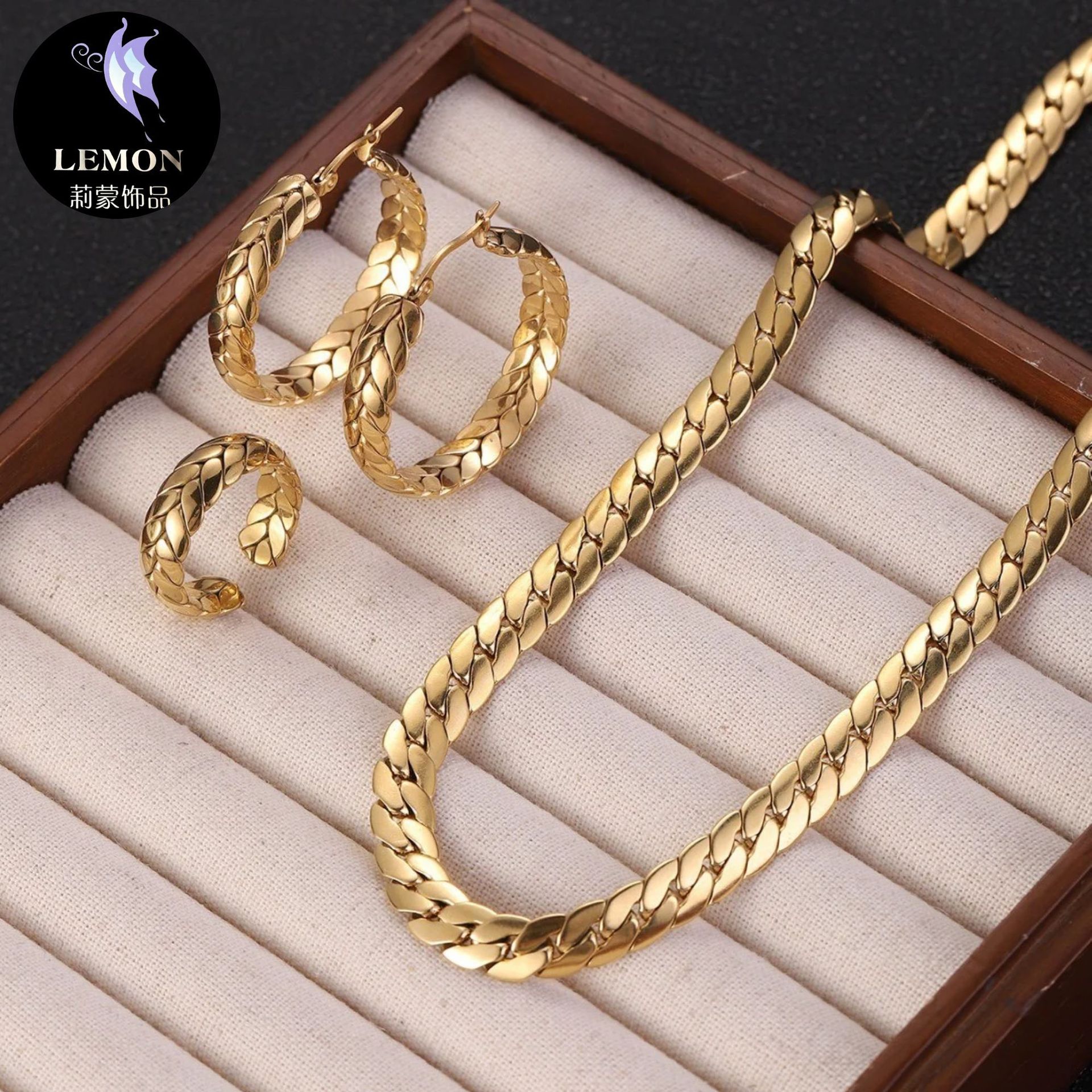 Wheat Stainless Steel Titanium Steel Clavicle Chain 18K Real Gold Electroplating Export Jewelry Necklace Earrings Ring Three-Piece Set