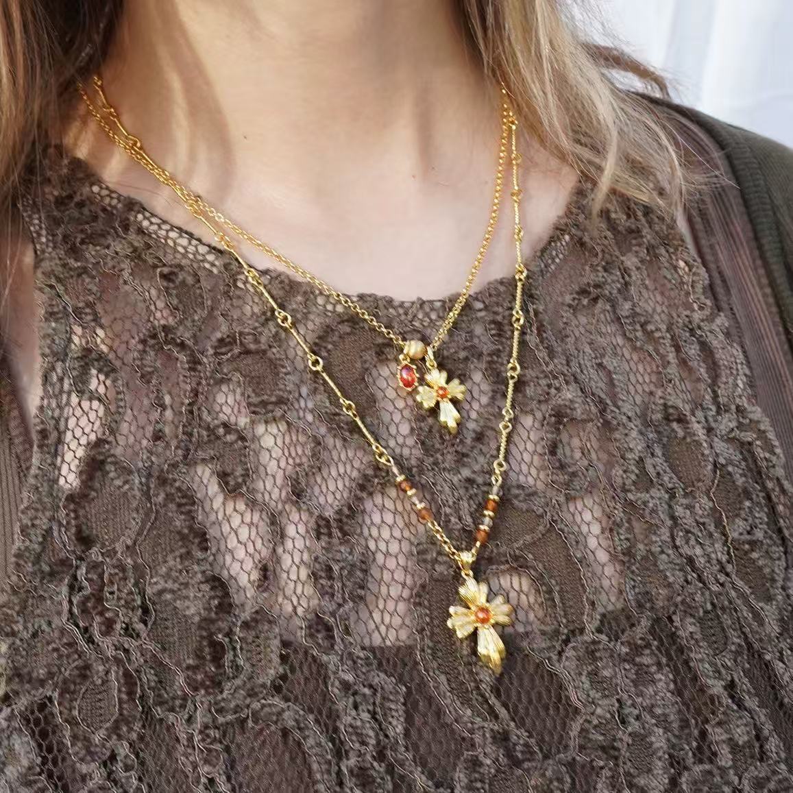 Autumn and Winter Jewelry Fran Flower Cross Beaded Necklace Earrings Set High-End Texture Clavicle Chain Versatile Accessories for Women