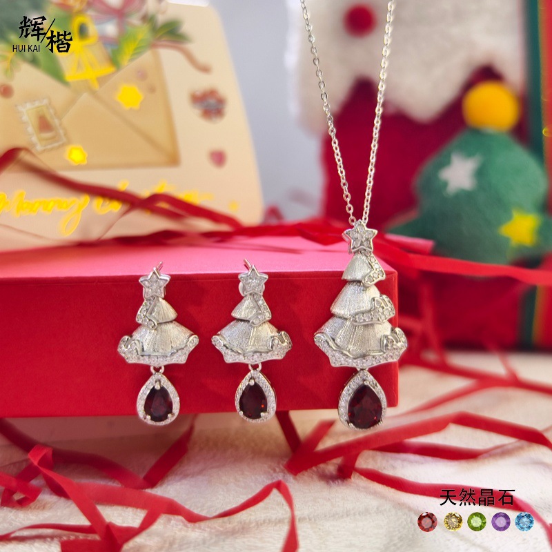 Light Luxury Christmas Gift S925 Silver Necklace Earrings Set Natural Crystal Peridot Brushed Craft Girl Jewelry