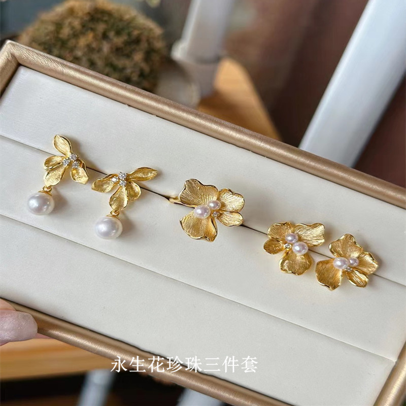 Cross-border s925 Sterling Silver Plated 18K Gold Yongsheng Flower Pearl suit Women's DIY Empty-rest Earrings Necklace Ring Three-piece Set