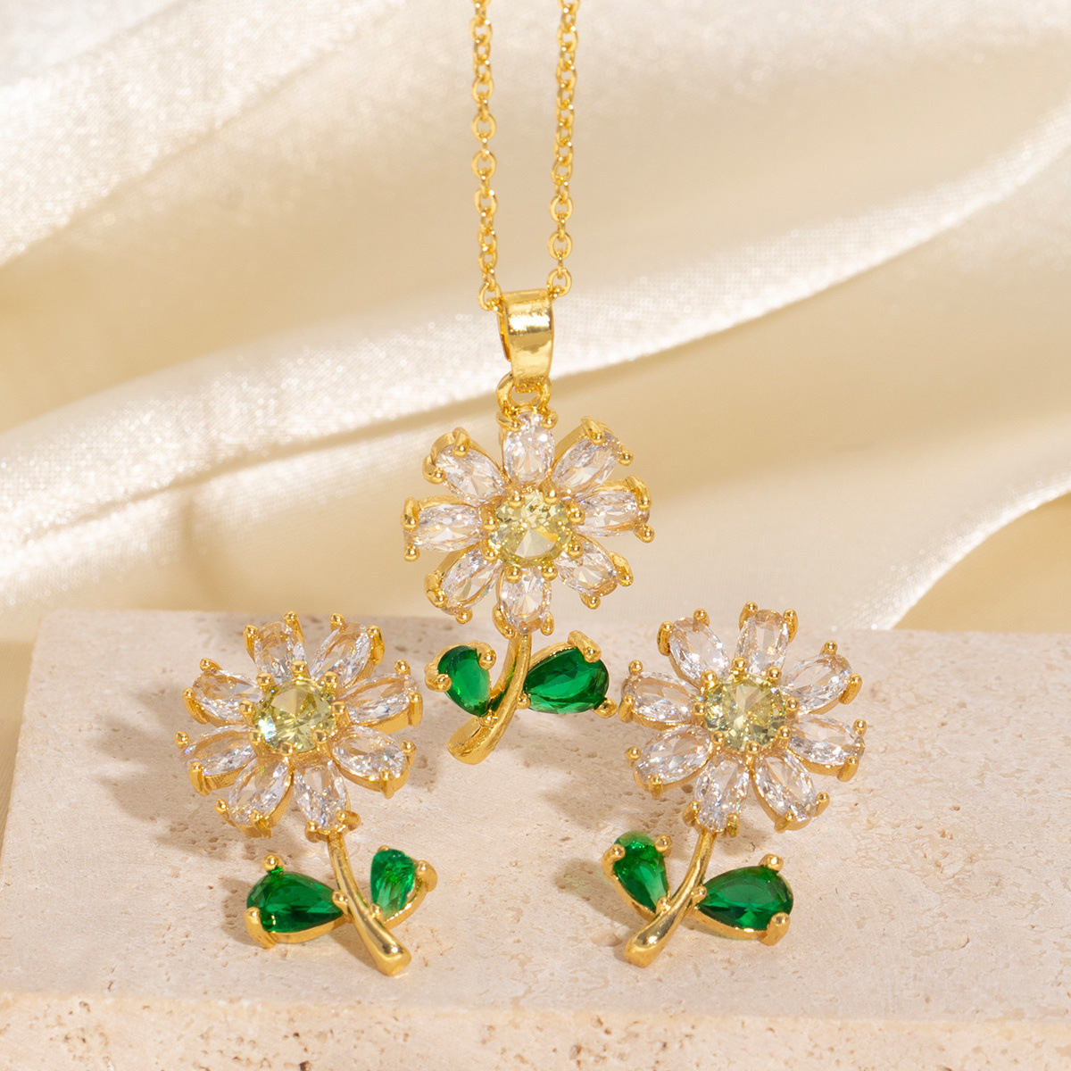 Amazon Cross-Border Fashion Light Luxury Calendula Necklace Earrings Set Copper Plated Real Gold Micro-Paved Zircon Jewelry Wholesale