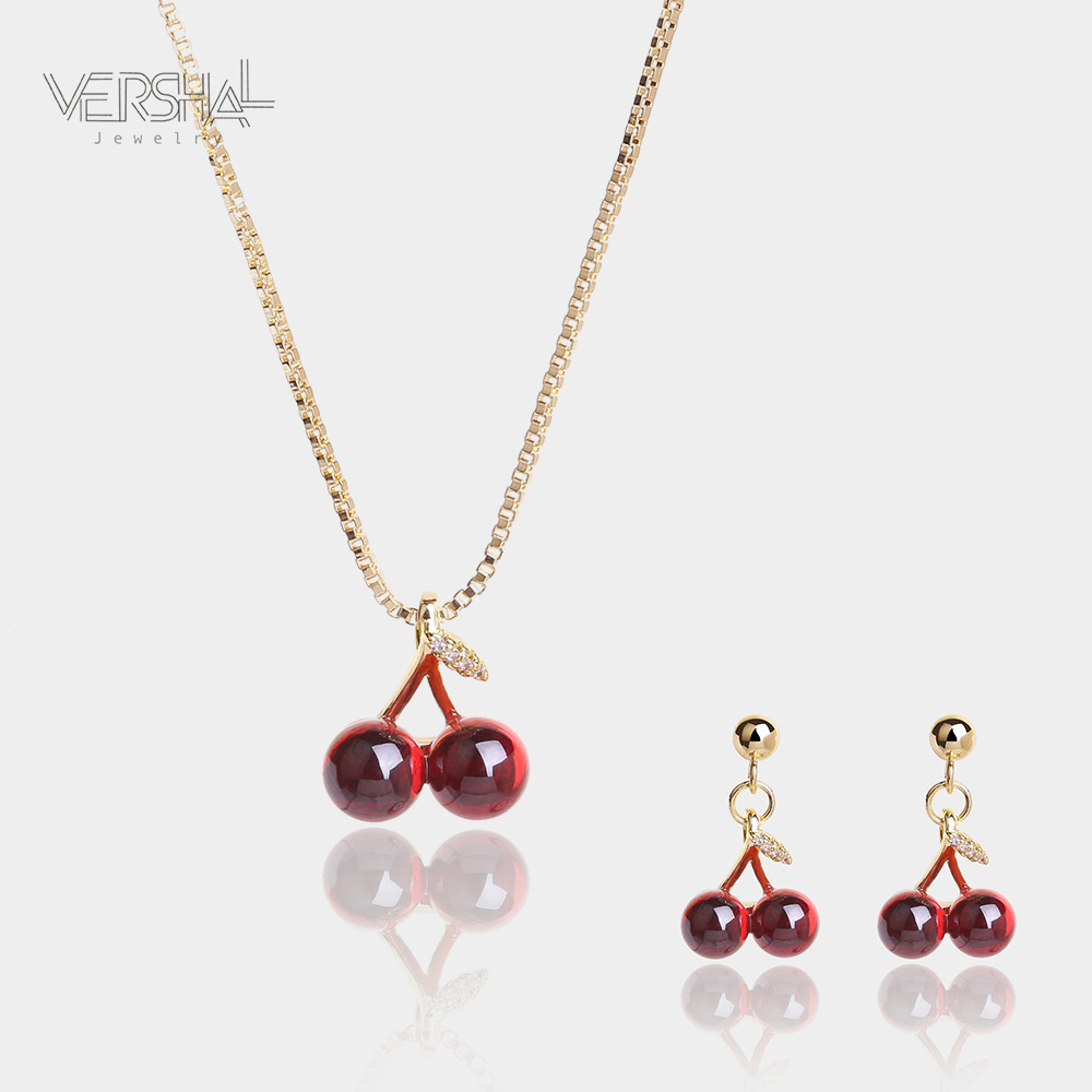 Japanese-Korean Style Red Cherry Pendant Necklace Real Gold Electroplated Women's Light Luxury Clavicle Chain Niche High-end Necklace Set