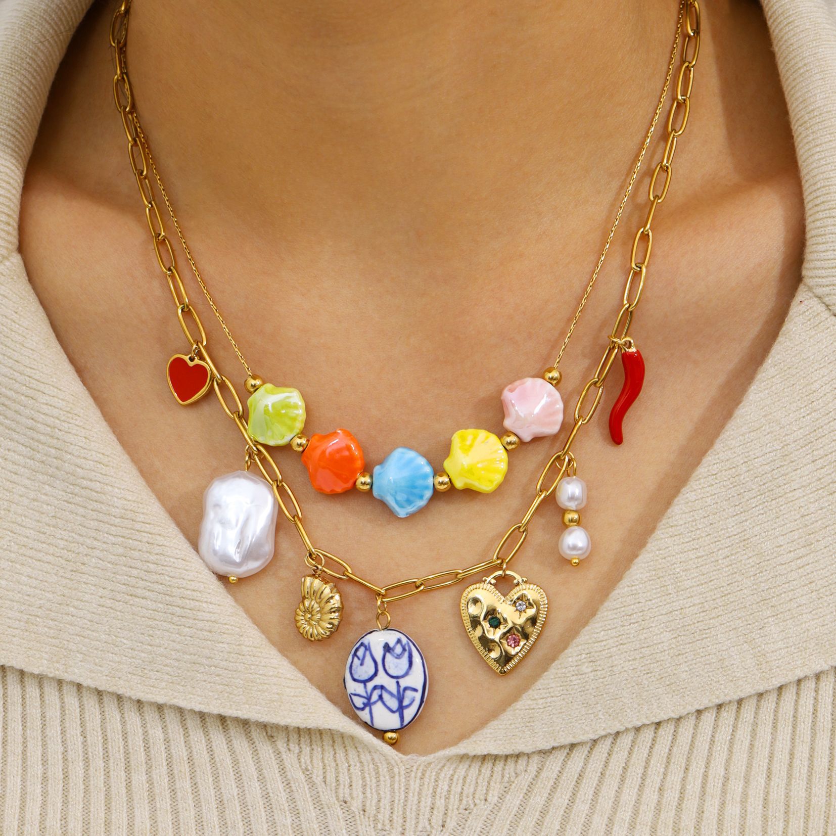Fashionable and Exquisite Colorfulful Ceramic Shell Conch Stainless Steel Plated 18K Gold Pendant Necklace Ocean Style Earrings Set