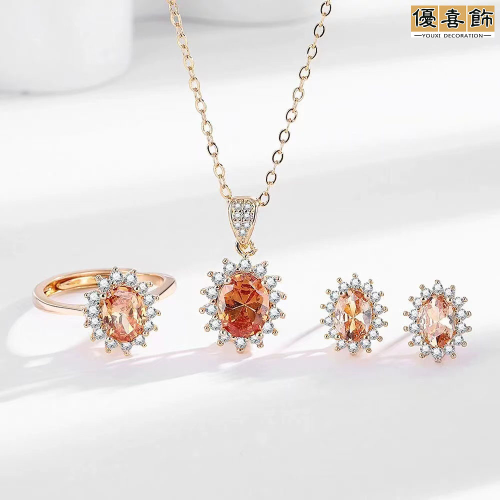 Europe and the United States cross-border live selling fashion champagne gold real gold necklace earrings ring jewelry suit full diamond three-piece set