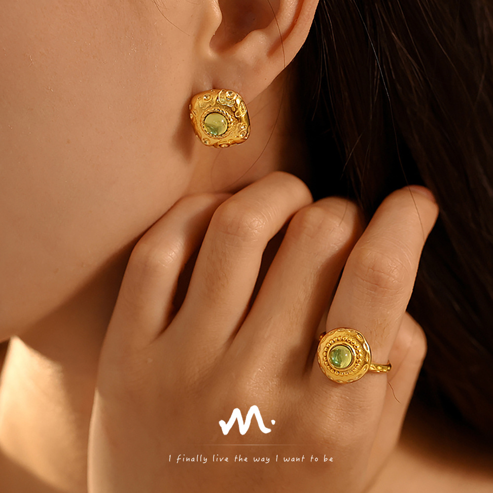 French Retro Square Threaded Green Glass Earrings Palace Style Open Ring Set Titanium Steel Pvd Plated 18K Real Gold
