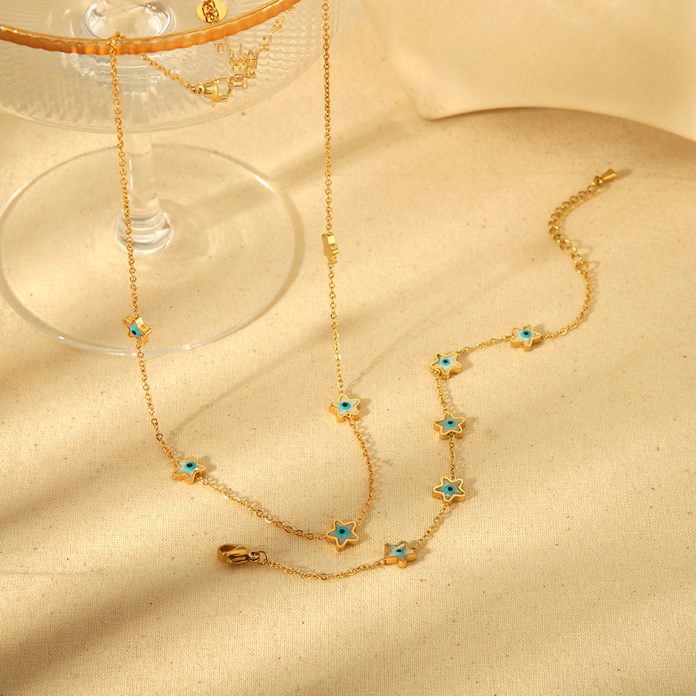 European and American Ins Stylish Retro Five-Pointed Star Oil Dripping Devil's Eye Necklace Bracelet Plated 18K Gold Stainless Steel Set for Women